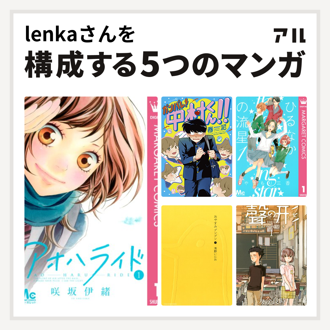 Lenkaさんを構成するマンガはアオハライド ガンバレ 中村くん ひるなかの流星 おやすみプンプン 聲の形 私を構成する5つのマンガ アル